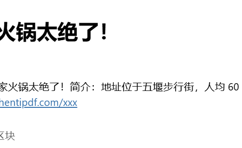 五堰这家火锅太绝了! 美食探店 zhentipdf 2026年3月25日 13:15 15 浏览 评论 标题:五堰这家火锅太绝了!简介:地址位于五堰步行街,人均 60 元,麻辣锅底超正宗…链接:https://www.zhentipdf.com/xxx。联系电话:0819-2887433